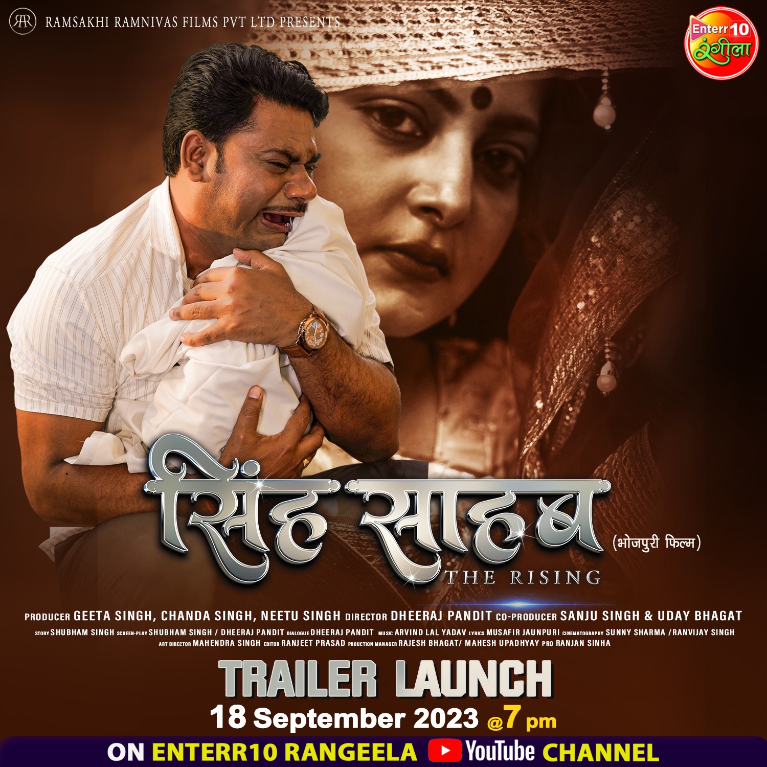 वाराणसी- भोजपुरी की बहूचर्चित फ़िल्म 'सिंह साहब द राइजिंग' की प्रतीक्षा कर रहे लोगो के लिए खुशखबरी है। इस गणेश उत्सव पर यानि 18 सितम्बर को शाम 7 बजे इंटर 10 रंगीला यूट्यूब चैनल पर रिलीज किया जाएगा और इसी दिन एक भव्य कार्यक्रम मे फ़िल्म के रिलीज डेट की घोषणा की जाएगी। फ़िल्म की निर्मात्री गीता सिंह ने बताया कि भोजपुरी की नंबर 1 टीवी चैनल भोजपुरी सिनेमा पर भी फ़िल्म का वर्ल्ड टीवी प्रीमियर किया जायेगा। भोजपुरी सिनेमा के स्वामित्व वाली कंपनी एंटर10 से 'सिंह साहब द राइजिंग' की फ़िल्म निर्माण कंपनी रामसखी रामनिवास फिल्म्स प्राइवेट लिमिटेड से इस बाबात एक एग्रीमेंट साइन किया है। एंटर10 के अपूर्व मेडतिया ने बताया कि भोजपुरी सिनेमा के यूट्यूब चैनल एंटर10 रंगीला पर ट्रेलर रिलीज किया जायेगा।