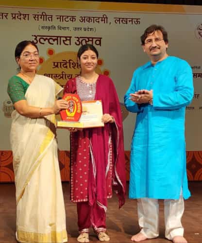 वाराणसी:- सनबीम इंग्लिश स्कूल भगवानपुर की कक्षा 12वीं की छात्रा व उदीयमान गायिका विदुषी वर्मा को उत्तर प्रदेश संगीत नाटक अकादमी ,लखनऊ (संस्कृति विभाग,उ.प्र.) द्वारा पिछले माह आयोजित प्रादेशिक संगीत प्रतियोगिता (किशोर वर्ग ) ठुमरी गायन में द्वितीय स्थान प्राप्त करने पर अकादमी द्वारा संत गाडगे प्रेक्षागृह में आयोजित उल्लास उत्सव पुरस्कार वितरण समारोह में भातखंडे संस्कृति विश्वविद्यालय, लखनऊ की कुलपति डॉ.मांडवी सिंह व संगीत नाटक अकादमी के निदेशक डॉ.शोभित नाहर ने प्रमाण पत्र एवं स्मृति चिन्ह देकर पुरस्कृत किया | विदुषी ने अपने उपलब्धि का श्रेय अपने माता- पिता गुरु पंडित देवाशीष दे,डॉ. सुकल्पा मुखर्जी एवं डॉ.रागिनी सरना को दिया | विदित हो कि विदुषी जौनपुर जिले के त्रिलोचन महादेव बाजार की निवासी है ||