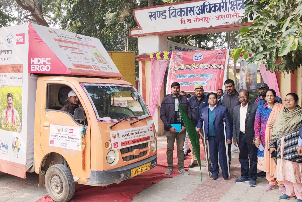 जनपद में चलाती जा रही भारत सरकार की महत्वाकांक्षी योजना "प्रधानमंत्री फसल बीमा योजना" का किसानों के बीच प्रचार -प्रसार के उद्देश्य से जनपद में चलाया जा रहा फसल बीमा योजना का प्रचार वाहन बुधवार को चोलापुर ब्लाक मुख्यालय पहुंचा।ब्लाक मुख्यालय पर खण्ड विकास अधिकारी अशोक चौरसिया ने फसल बीमा योजना के रथ को हरी झंडी दिखाकर रवाना किया।बीडीओ ने किसानों से 31 दिसम्बर से पहले रबी फसलों का बीमा कराने की अपील की और भारत सरकार की महत्वाकांक्षी योजना का किसानों को लाभ उठाने की सलाह दी।