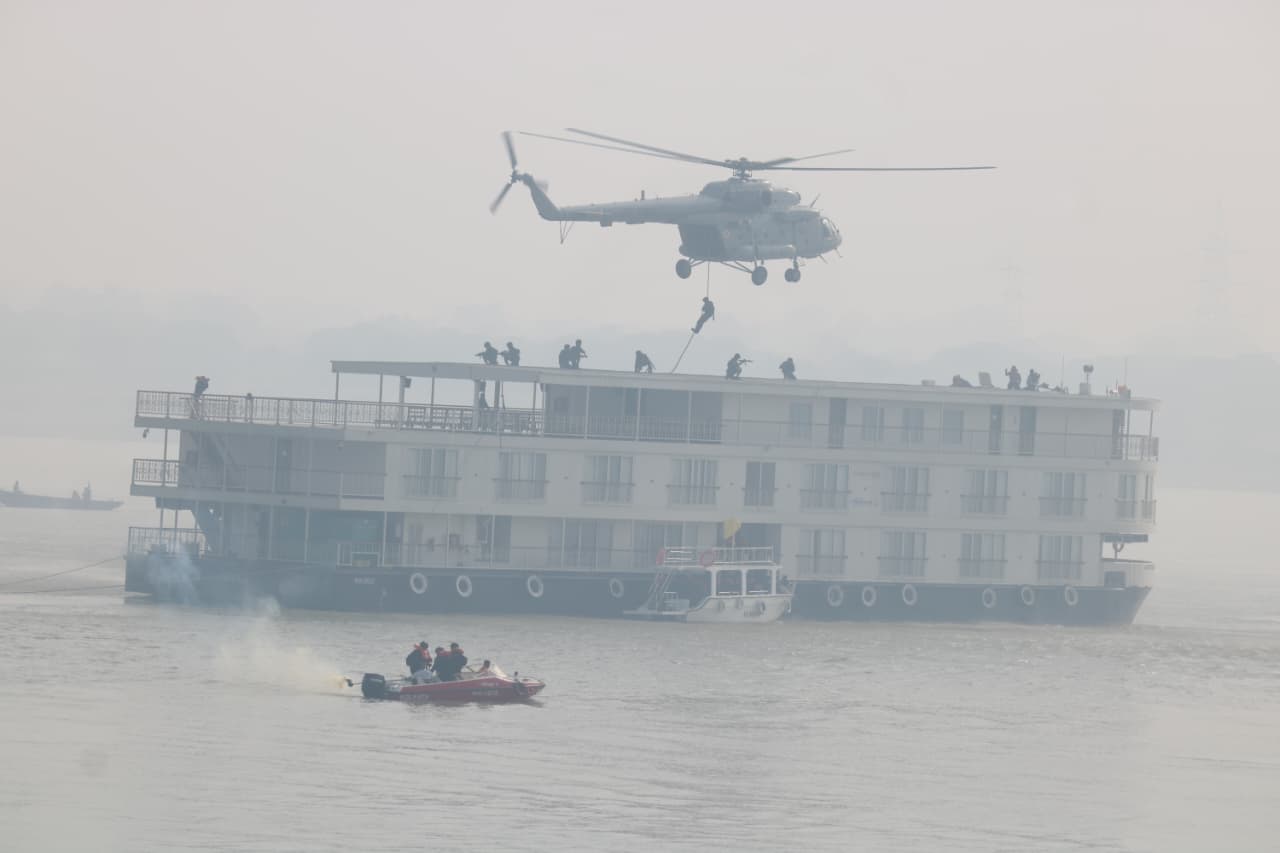14 नवंबर, वाराणसी | काशी स्थित गंगा नदी के संत रविदास घाट के समीप एक यात्री क्रूज़ पर संभावित आतंकी हमले एवं हाईजैकिंग की परिकल्पना पर आधारित सघन मॉक अभ्यास *‘गांडीव VII’* का सफलतापूर्वक आयोजन किया गया। एनडीआरएफ वाराणसी की टीमें—जो गंगा नदी के जल क्षेत्र में हमेशा तैनात रहती हैं के द्वारा उप महानिरीक्षक श्री मनोज कुमार शर्मा के दिशा-निर्देशन में उत्कृष्ट तैयारी और समर्पण के साथ प्रतिभाग किया गया तथा आपातकालीन परिस्थितियों में अपनी त्वरित, प्रभावी और समन्वित प्रतिक्रिया क्षमता का सफल प्रदर्शन किया।